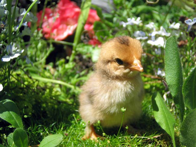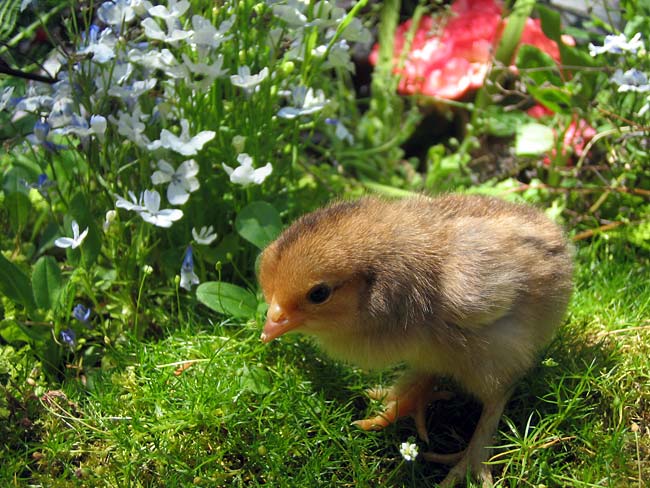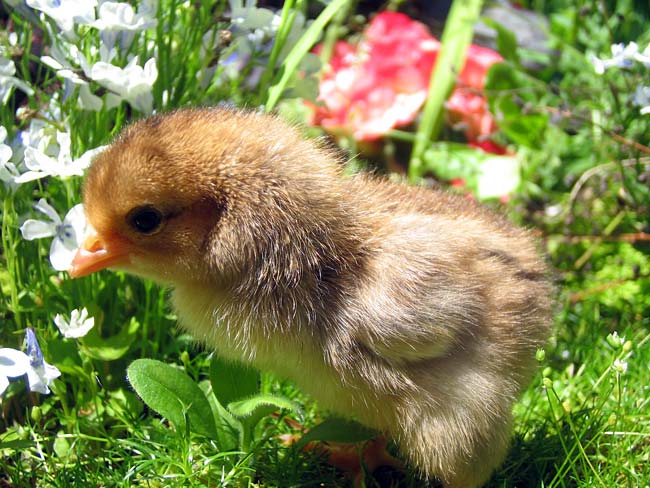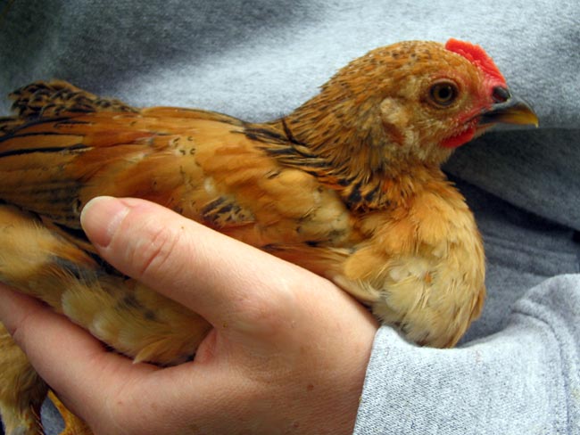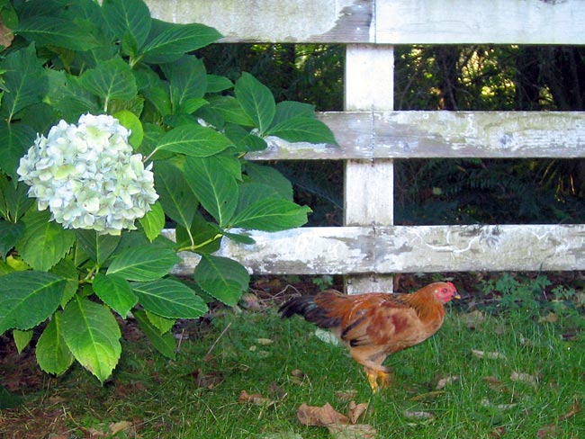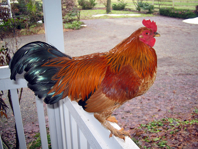 The day-old chick my neighbors found orphaned in the road has outgrown the heat lamp in the bathroom and has revealed himself to be a rooster, now mostly called Chicky Boy. He is a bantam (miniature) rooster with feathered legs but no specific breed that I know of. Chicky grew into a beaut of a rooster, though not nearly as big as the resident Chico who laughs and calls him names and never lets Chicky join in any chicken games. So it was time for Chicky Boy to find a home and some hens of his own, which he did, and he is now living the good life on another farm where he is known as Brutis.